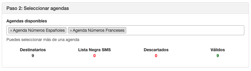 Seleccionar agendas para envío masivo SMS - En este ejemplo, hemos escogido una ruta de envío que permite envíos a Francia. La agenda números españoles contiene 6 contactos y la agenda números franceses 3. El total de contactos únicos sumando todas las agendas es 9 (Destinatarios) y los contactos válidos para este envío son 9, es decir, todos los contactos de las agendas.
