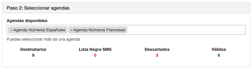 Seleccionar agendas para envío masivo SMS sin ruta de envío - En este ejemplo, hemos escogido una ruta que no permite envíos a Francia. La agenda números españoles contiene 6 contactos y la agenda números franceses 3. El total de contactos únicos sumando todas las agendas es 9 (Destinatarios) y los contactos válidos para este envío son 6, todos excepto los 3 franceses que están descartados para el envío.