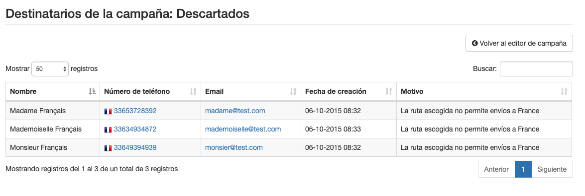 Seleccionar agendas para envío masivo SMS sin ruta de envío - Si pulsas encima de cada uno de los contadores, podrás consultar el listado de contactos que lo componen. En este caso, estamos viendo los descartados del ejemplo anterior.
