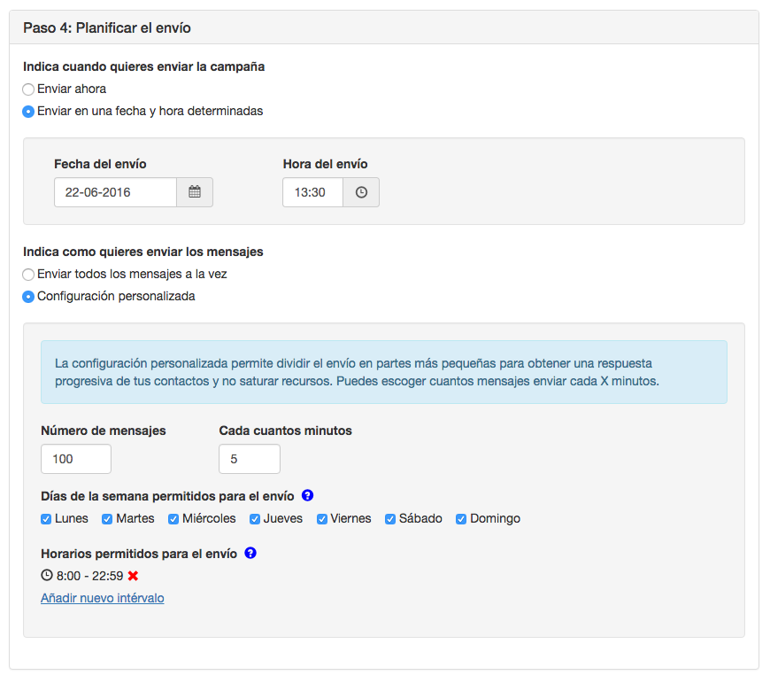 Con los campos 'Número de destinatarios' y 'Cada cuantos minutos' eliges los mensajes a enviar cada 'X' minutos. Así obtendrás una respuesta progresiva de los destinatarios del mensaje y evitarás colapsar tus recursos, por ejemplo un CallCenter.