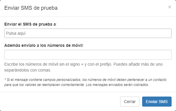 Pulsa sobre el botón 'Enviar SMS de prueba' y introduce los teléfonos a los que quieres enviar la prueba. Los mensajes enviados serán cobrados.