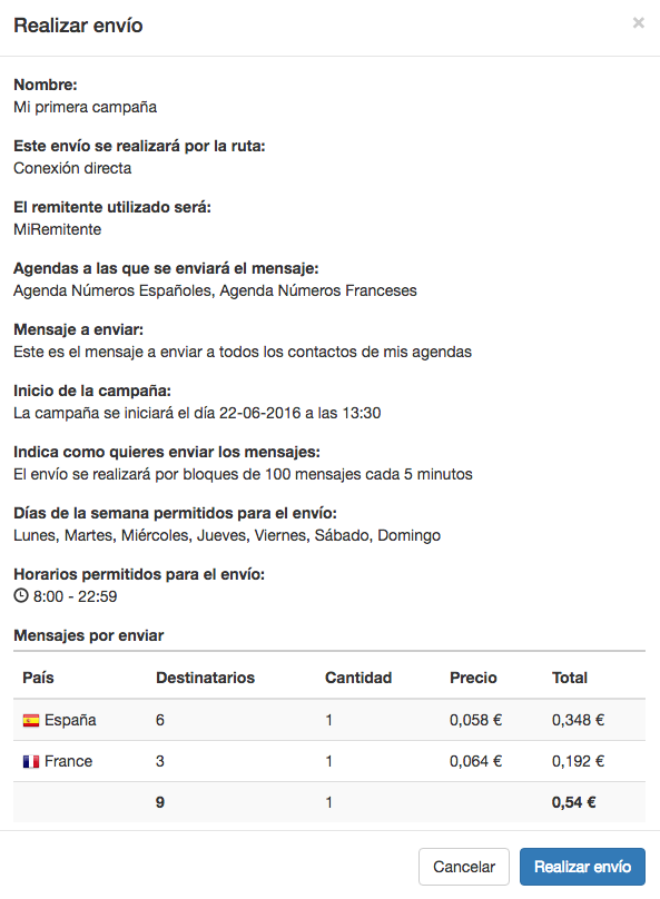 Si el envío se ha validado correctamente, verás un resumen del envío que vas a realizar con todas las opciones que has escogido en los pasos anteriores. También podrás consultar un informe con la cantidad de mensajes que se enviarán por país y su precio.