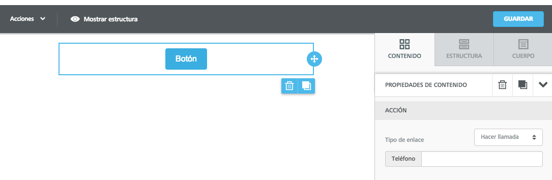 Los destinatarios pueden realizar una llamada telefónica sólo con hacer clic en este botón. Selecciona el tipo de enlace 'Hacer llamada' e introduce el número de teléfono al que quieres que se realice la llamada.