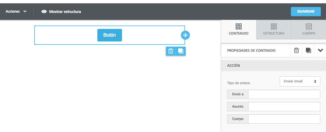 Selecciona el tipo de enlace 'Enviar email'' para que los destinatarios pueden enviarte un email directamente desde la Landing. Al pulsar el botón se abrirá la aplicación de envío de email del destinatario. Indica la dirección a la que se debe enviar el email, el asunto y el cuerpo del mensaje a enviar.