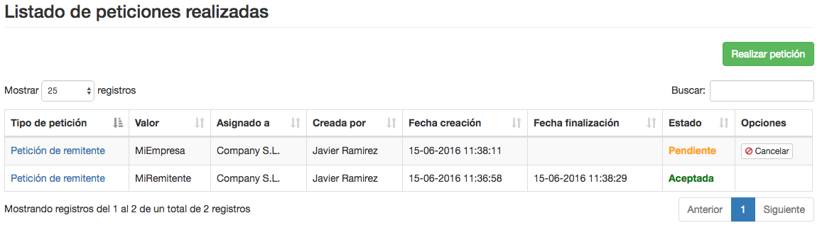 Tanto si tu petición es aceptada o rechazada, se te enviará una notificación y un email para que estés al corriente en cada momento de tus peticiones de remitente